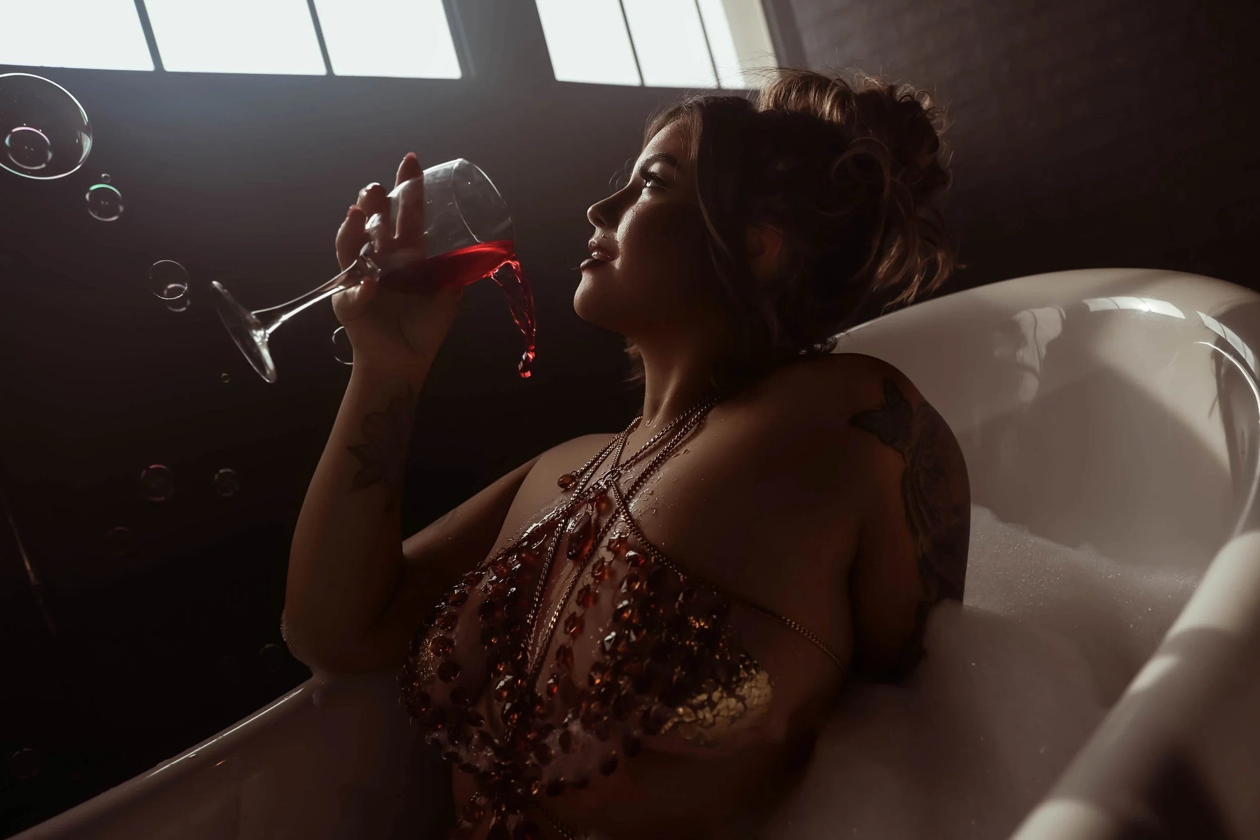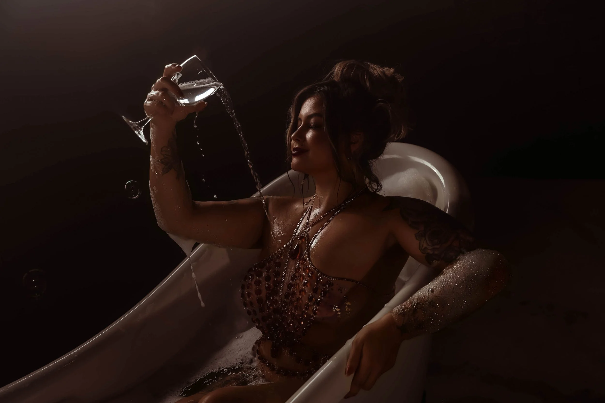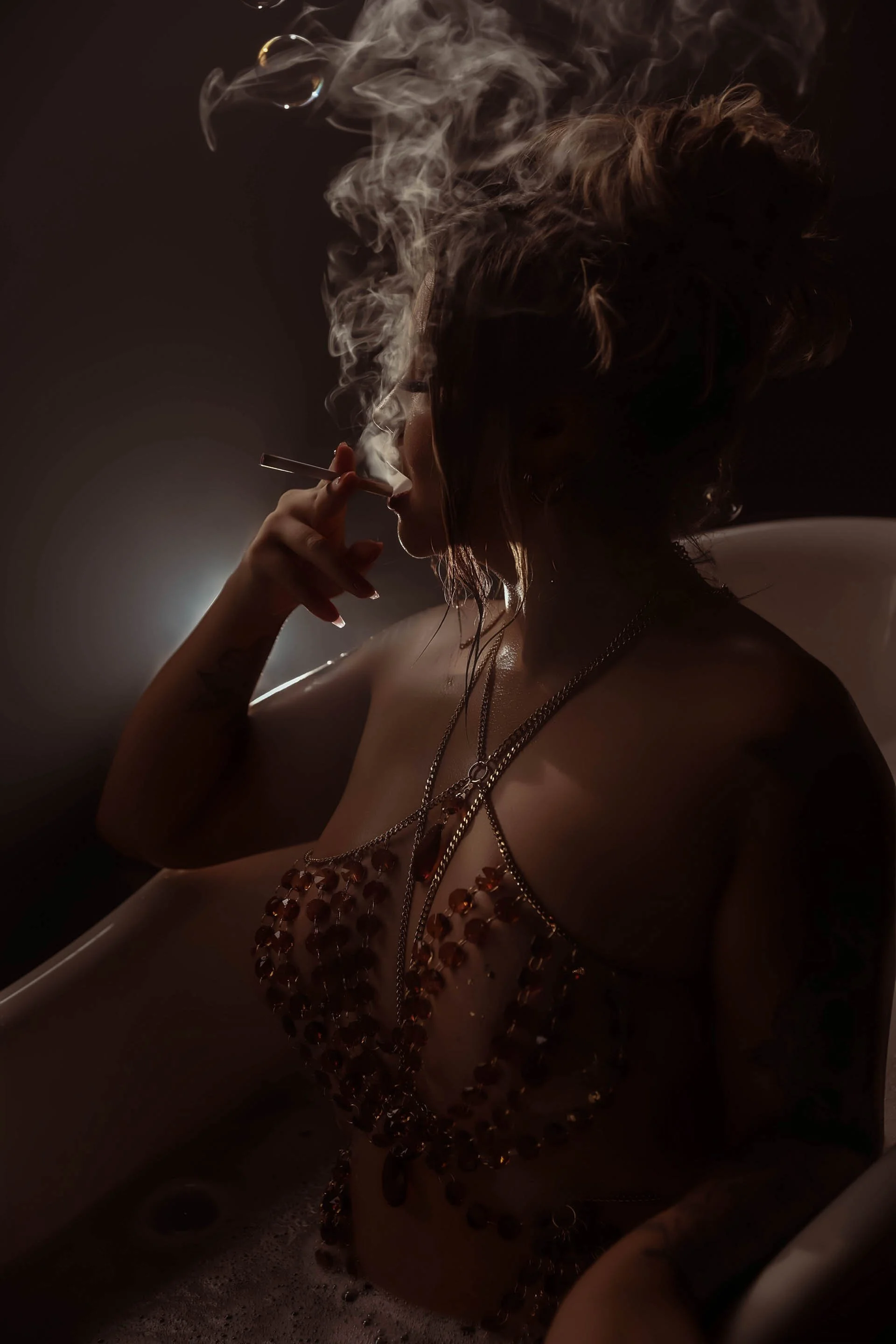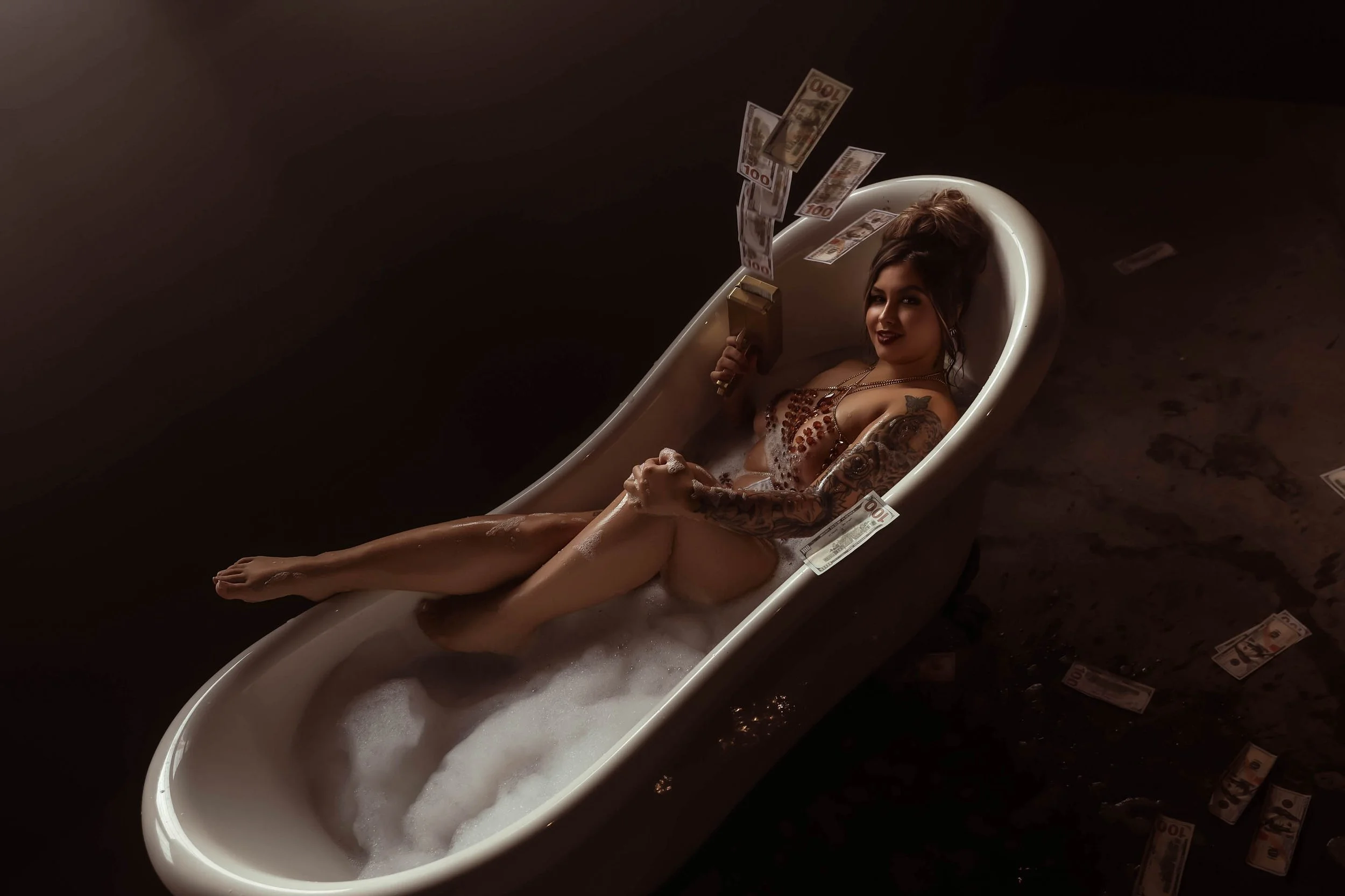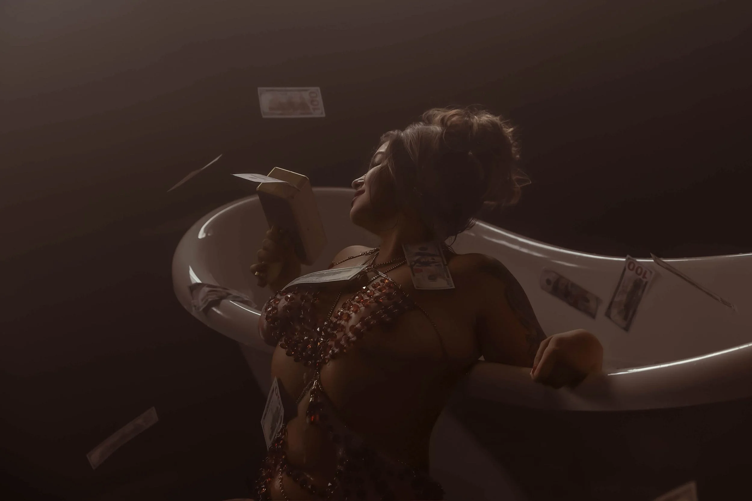 "Glamorous boudoir shoot in an industrial clawfoot tub with bubbles and amber crystal body jewelry — woman smoking and surrounded by money, channeling femme fatale energy in a dark, cinematic setting."