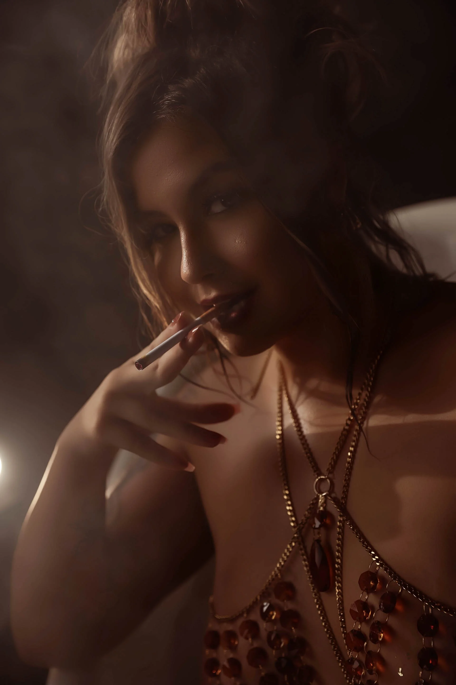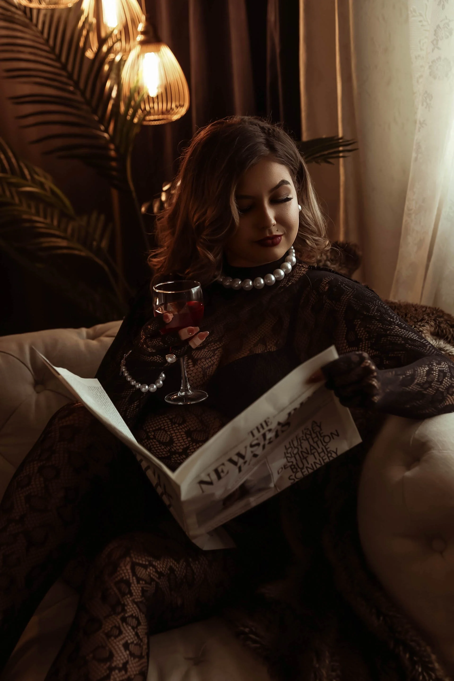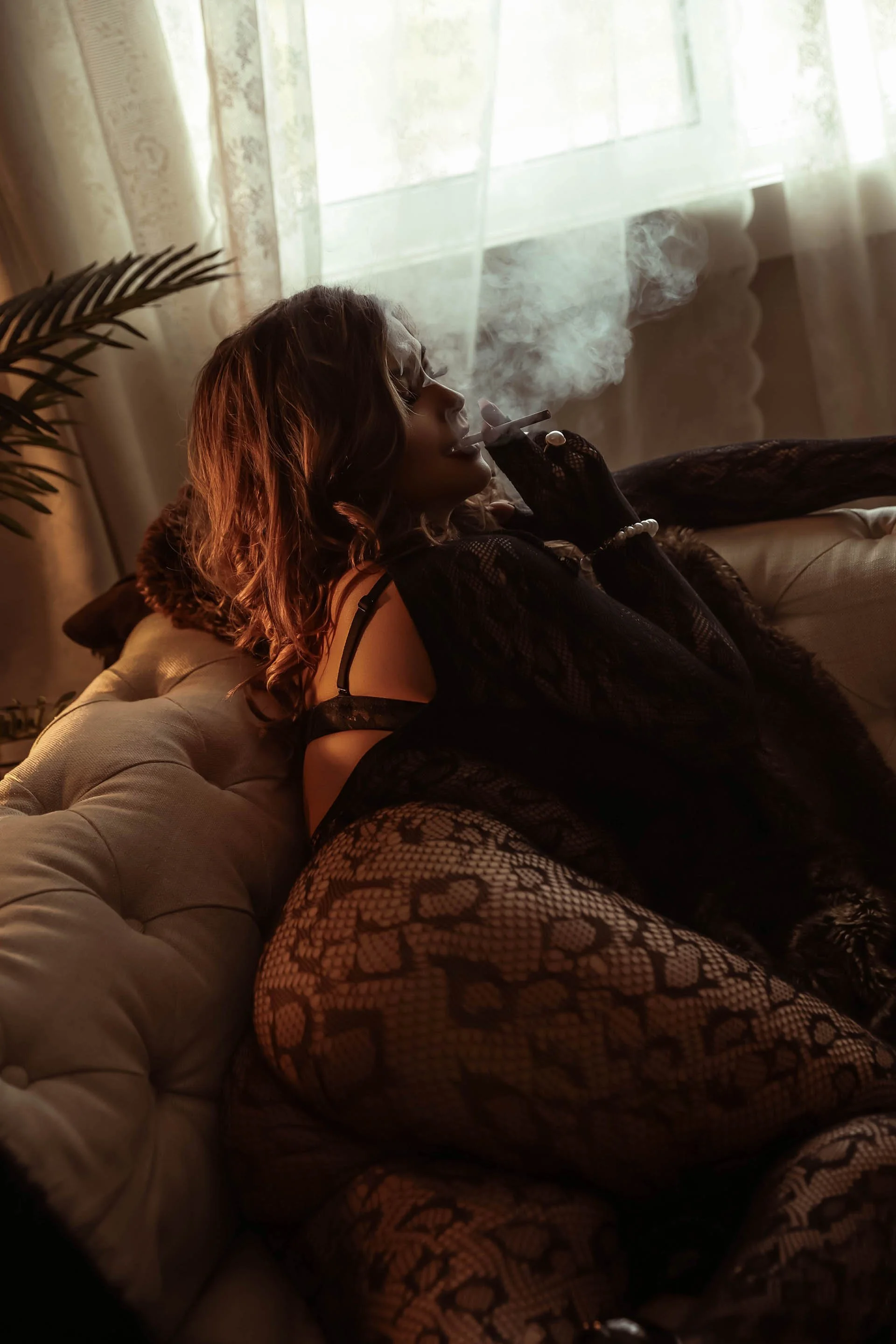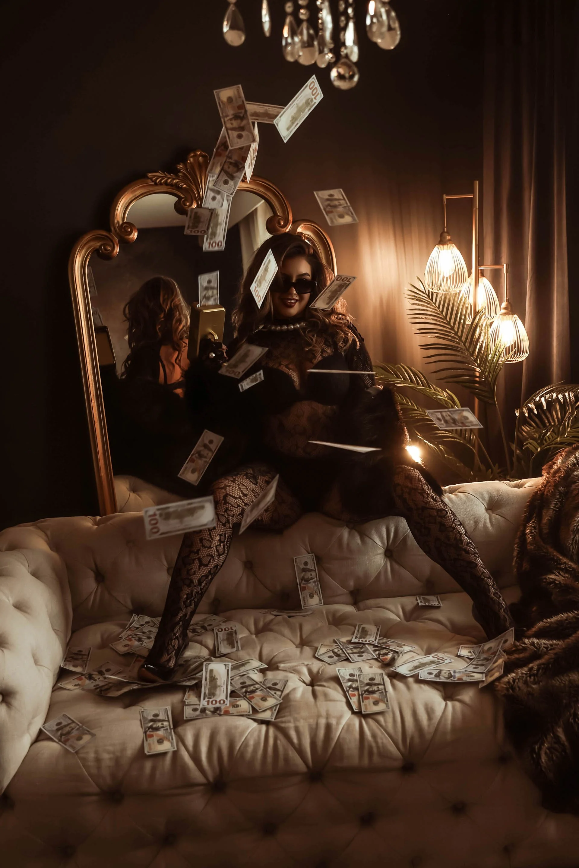 This isn’t your soft, romantic boudoir session. Think fur coats and red lipstick, crystal-drenched lingerie, and cigarettes balanced between manicured fingers. We’re channeling old-money glam with a dark edge — the kind of energy that says “I built this empire and I’ll burn it down if I feel like it.”
