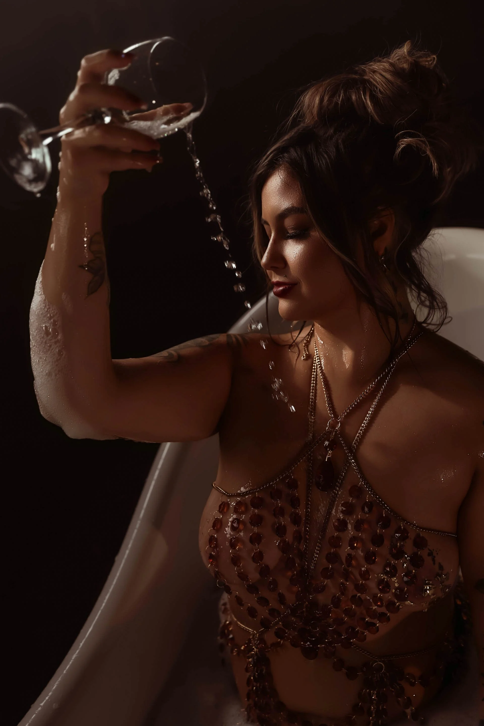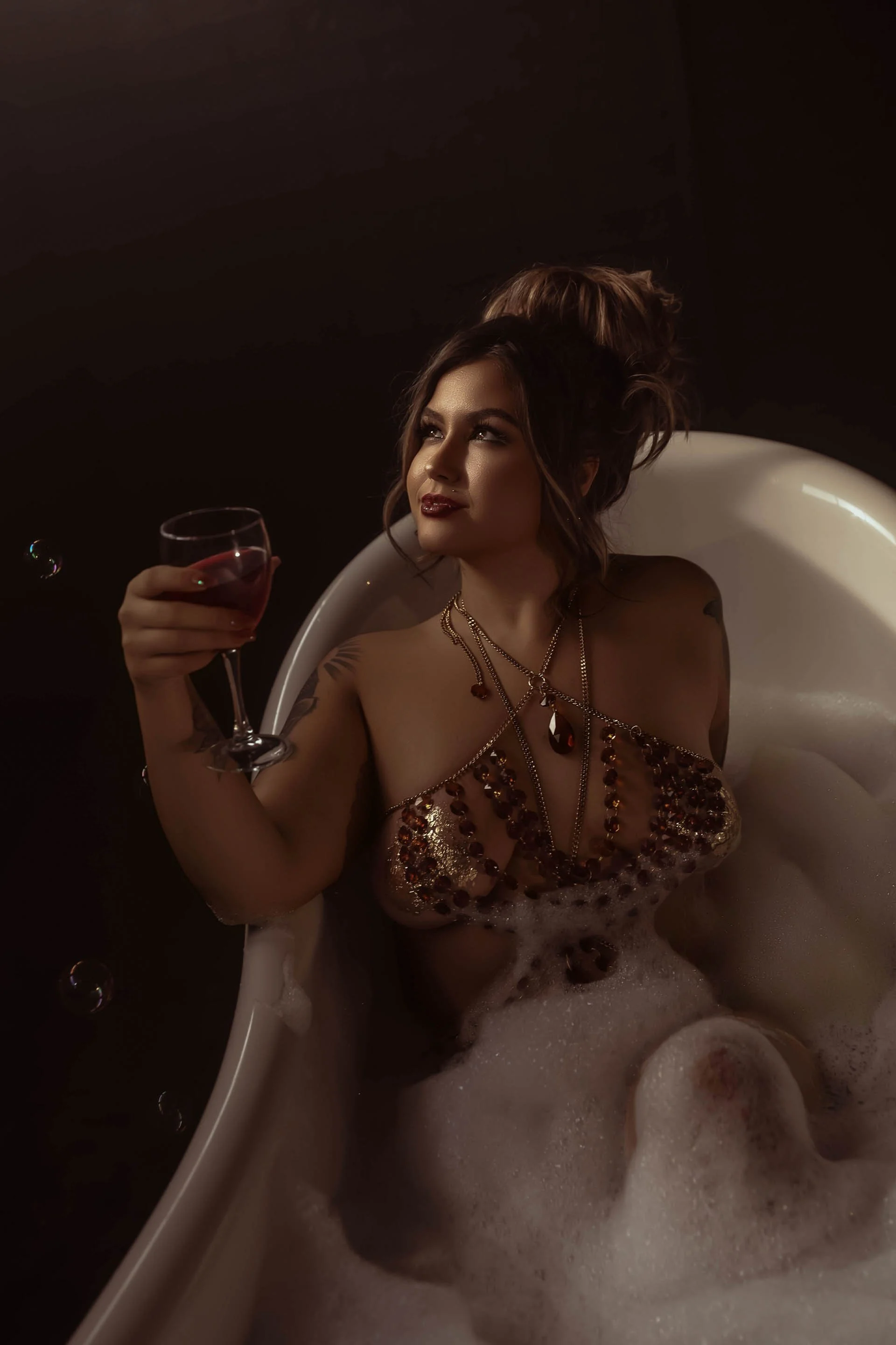 Finally, we took the vibe to another level in my new clawfoot tub — a moody, dramatic space that blends grit and glamour. Surrounded by shadows and softened by a bubble machine, this look was completed with amber-colored crystal body jewelry and, of course, more money, more smoke, and more attitude. It’s the ultimate femme-fatale fantasy — a woman who is both art and danger, softness and strength.