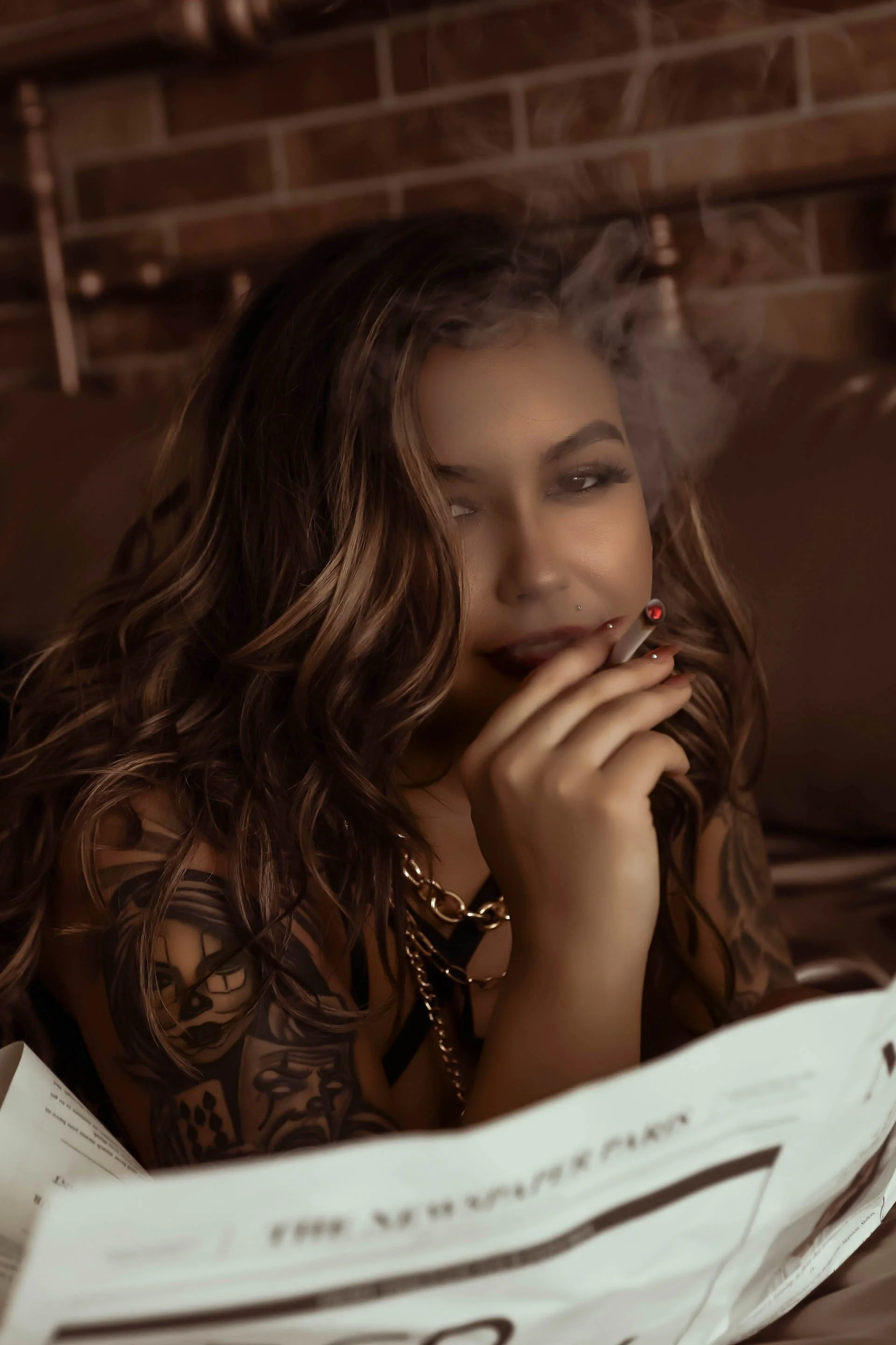 Next, we slipped into something even more intimate: my bedroom set, with soft taupe sheets against an exposed brick wall. Wine glasses clinked, smoke curled lazily through the air, and that iconic money gun made another appearance. These images are less about softness and more about sinful satisfaction — the pleasure of taking up space, breaking rules, and doing exactly what you want.